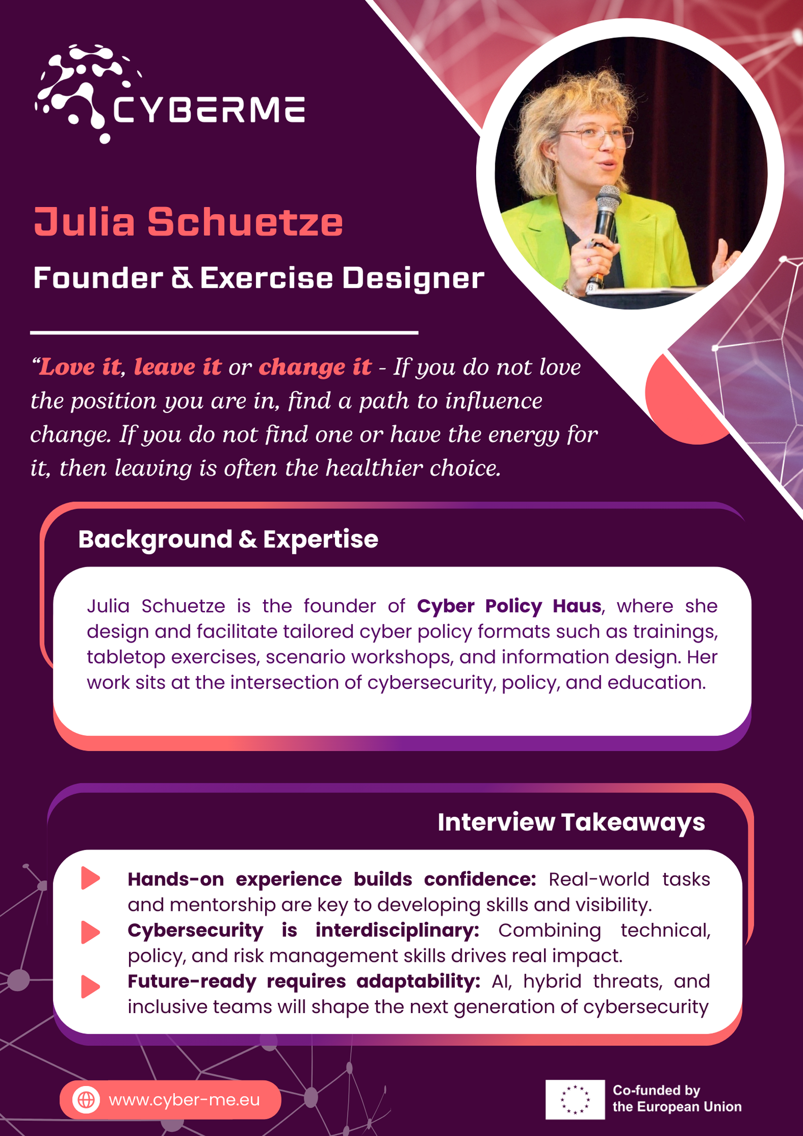 I am Julia Schuetze and the founder of Cyber Policy Haus, where I design and facilitate tailored cyber policy formats such as trainings, tabletop exercises, scenario workshops, and information design. My work sits at the intersection of cybersecurity, policy, and education. I collaborate closely with designers and governments, focusing on national cybersecurity governance, crisis management, and hybrid warfare exercises. Over the years, I have worked extensively on issues such as state resilience, cyber diplomacy, and the role of civil society in cybersecurity dialogue. My background allows me to translate complex cyber risks into practical, collaborative learning formats that work across sectors and disciplines.